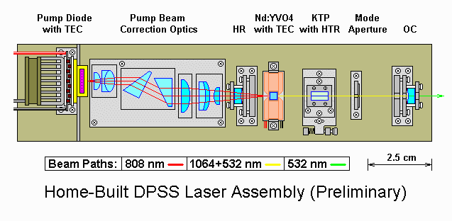 For an example of a higher power and more challenging laser, see the very preliminary diagram of a Typical Home-Built DPSS Laser Assembly. This should be capable of between 100 mW and 2 W of green output. However, any of the higher power versions, at least, would be quite complex and expensive projects. In addition to all the precision machining, the cost of the pump diode, large vanadate and KTP crystals, and optics, there would need to be considerable electronics: The driver for the pump diode, the pump and vanadate TECs with their controllers, and the KTP heater and its controller. Note that while the beam correction optics shown in this diagram use anamorphic prisms, that approach will only work for up to perhaps a 2 to 4 W pump diode. For higher power using a wide stripe pump diode, bar, or array of bars, either a fiber-coupled or fiber bundled diode laser source with output focusing optics, or the use of a lens duct and HR mirror on the vanadate crystal would be needed.