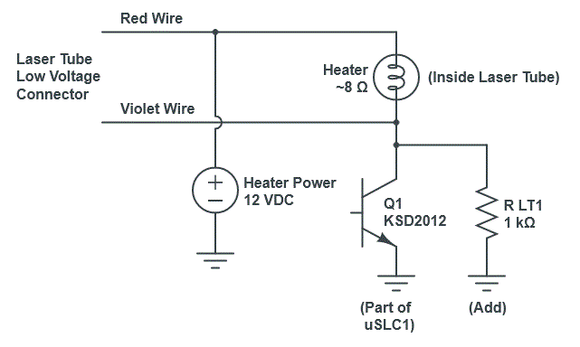 IMPORTANT: Since the tube current passes through the red/violet wires, it is critical that it has a place to go. Thus the resistor "R LT1" is essential to provide a path bypassing the heater drive transistor (Q1) on the µSLC1 PCB. Without a bypass, the tube current will attempt to go through the transistor when it is off and may blow it and possibly other stuff as well. The value is not critical - anything from 100 to 2K ohms should be acceptable. But is should be soldered directly across the tranistor so it can't come loose.