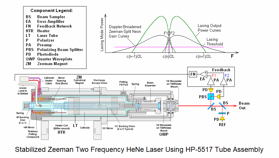 However, unlike the non-Zeeman case where one can lock on either side of the gain curve depending on the polarity of the error signal, with the Zeeman laser, there is only one place to obtain a beat. In other words, it's possible to lock so that the two components - F1 and F2 - are equal in two locations. One is where the Zeeman-split longitudinal mode is between the split gain curves and there will be a beat. The other is where there are actually two separate (non-Zeeman) longitudinal modes with equal amplitude but far far away at the longitudinal mode spacing of the laser tube. In that case, there will be no beat without a fancy high speed detector since the frequency would be over 1 GHz.