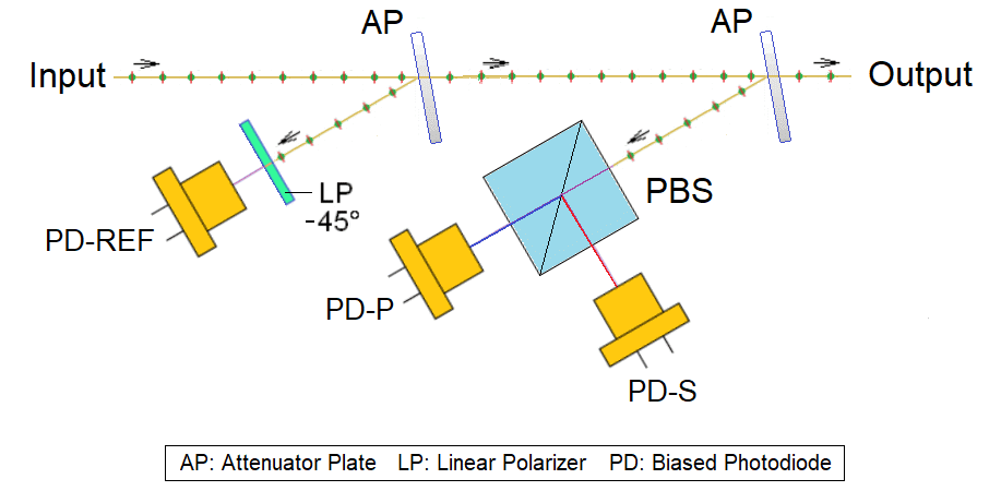 Note that when using the Attenuator Plate (AP) as a beam sampler, it should oriented at a small angle (much less than 45 degrees) to minimize effects on polarization. 15 to 20 degrees is recommended as shown below: