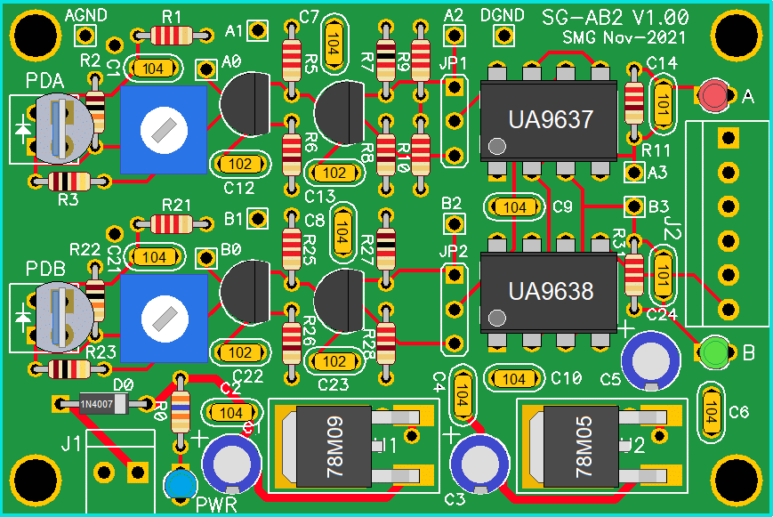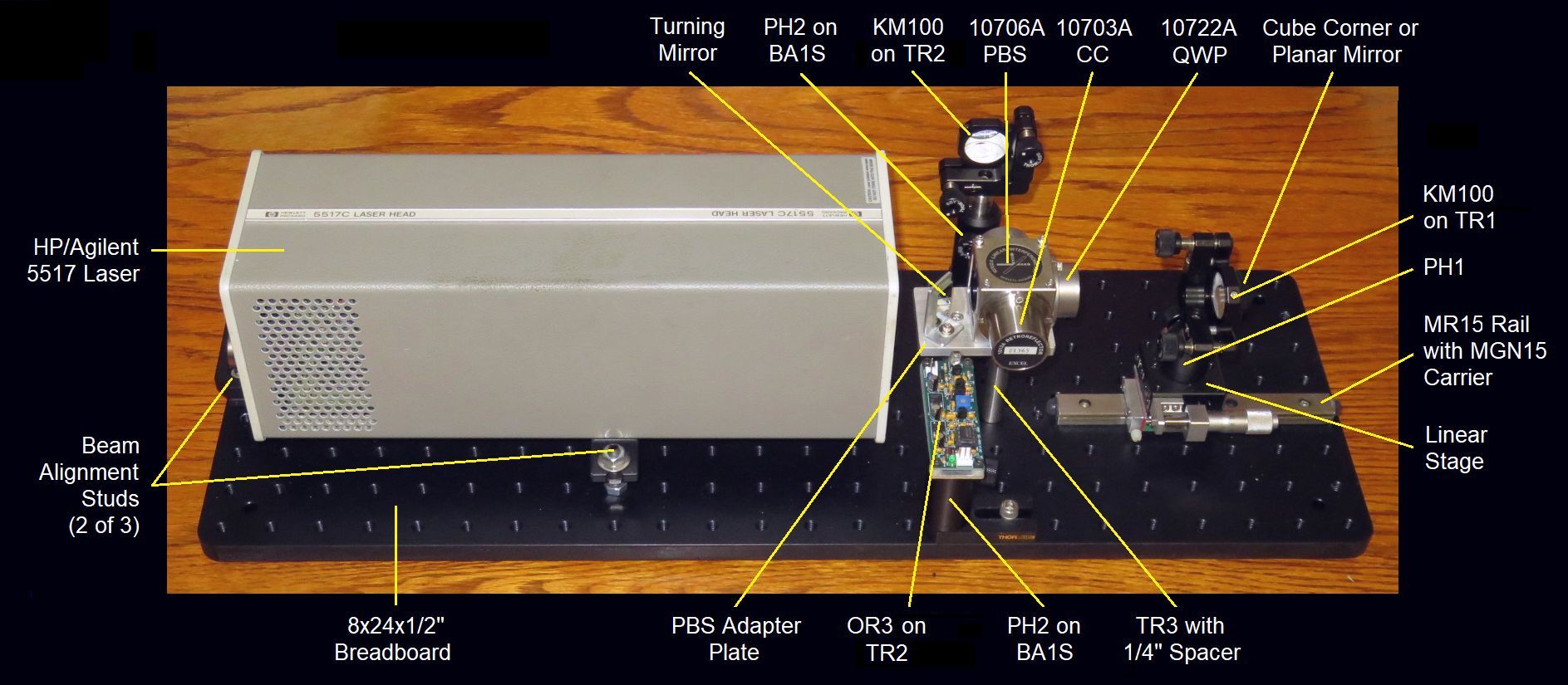 But first are annotated photos of the V2.1 setups for both Homodyne and Heterodyne with all the optics on the PBS cube for reference. V2.0 is virtually identical except for the height of the optical centerline. V1.0 and V1.5 (homodyne only) will be generally similar except primarily for the custom un-anodized breadboard and classy wood block PBS mount. But this should serve for parts identification. Click on the relevant annotated graphic for a high resolution view displayed in a single new window or tab depending on your browser's settings.