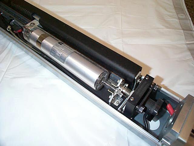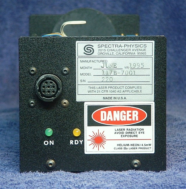 This is also a rather large HeNe laser but not nearly the size of the SP-125. It is self contained with an internal brick type power supply. Rated output power is around 35 mW (CDRH max: 60 mW). The beam cuts through T-120 video tape like butter when focused. Dimensions are: 42-1/2"(L), 5-7/8"(W), 4-9/16"(H) including foot projection. Weight is approximately 20 lbs.
