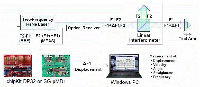This guide deals specifically with setting up the laser, interferometer, optical receiver, and their power supplies. Complete information on wiring the chipKit DP32 or SG-µMD1 board to the REF MEAS signals and running the µMD1 Windows GUI may be found in the µMD1 Installation and Operation Manual or µMD2 Installation and Operation Manual. (Note: These and the links below open in a single new tab or window.)