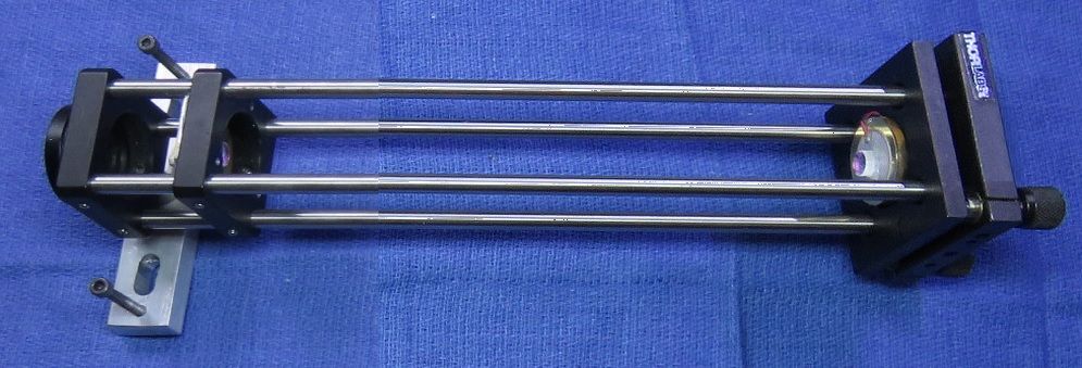 The benefit of the deluxe kits is that in addition to what's in the basic kit, they include commercial parts (mostly from Thorlabs) for the major mechanical assembly so that much of the scavanging for scrap sheet metal and other tid-bits is eliminated. The Thorlabs "Cage System" provides a rigid frame allowing for initial adjustment which can then be locked in place. The completed frame and other parts similar to what's in the planar SFPI kits are shown below.