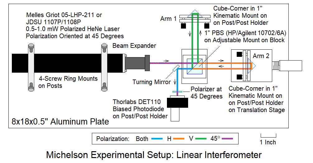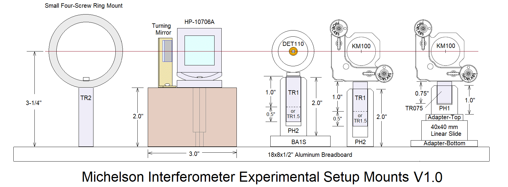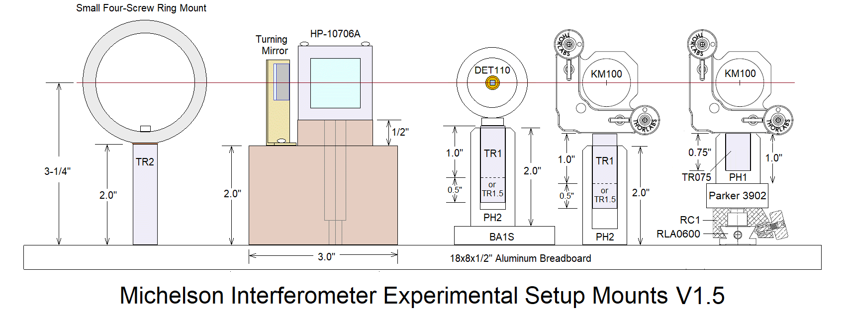 There is no need to construct all of the interferometer configurations described below. Doing the Linear Interferometer (LI) first makes sense since there are detailed instructions on its construction, alignment, testing. Building the High Stability Plane Mirror Interferometer (HSPMI) would be the logical next step moving from cube corners to plane mirrors. It also permits the loudspeaker and/or PZT actuators to be added. Then after that one of the others. Perhaps coordinate with the other project students using this same kit so that each of you do different ones.