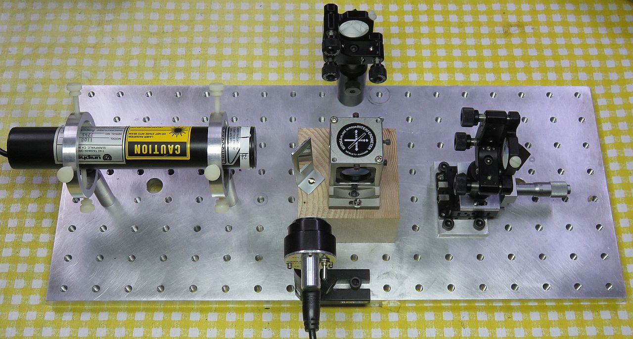 The experimental setups will enable various interferometer configuration to be easily implemented and then tested with one arm being on a micrometer linear stage and/or with some other device or material that can vary the path length precisely. The light source is a Class II 633 nm Helium-Neon laser (HeNe for short) with an output power of between 0.4 and just over 1 mW. The basic detector is a biased photodiode connected to a dual channel digital oscilloscope. Variations and enhancements to these will be offered as options.