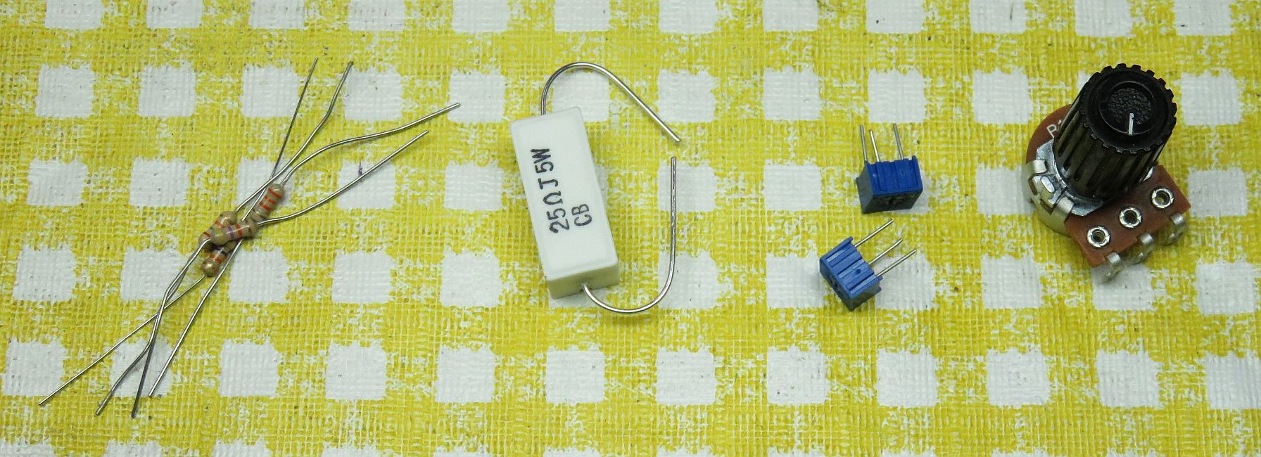 The ones used mostly here will look similar to the top example with the 4 band code and are rated at 1/4 watt with a body around 1/4 inch long. Their leads may be trimmed to conveniently fit the solderless breadboard (or PCB if used).