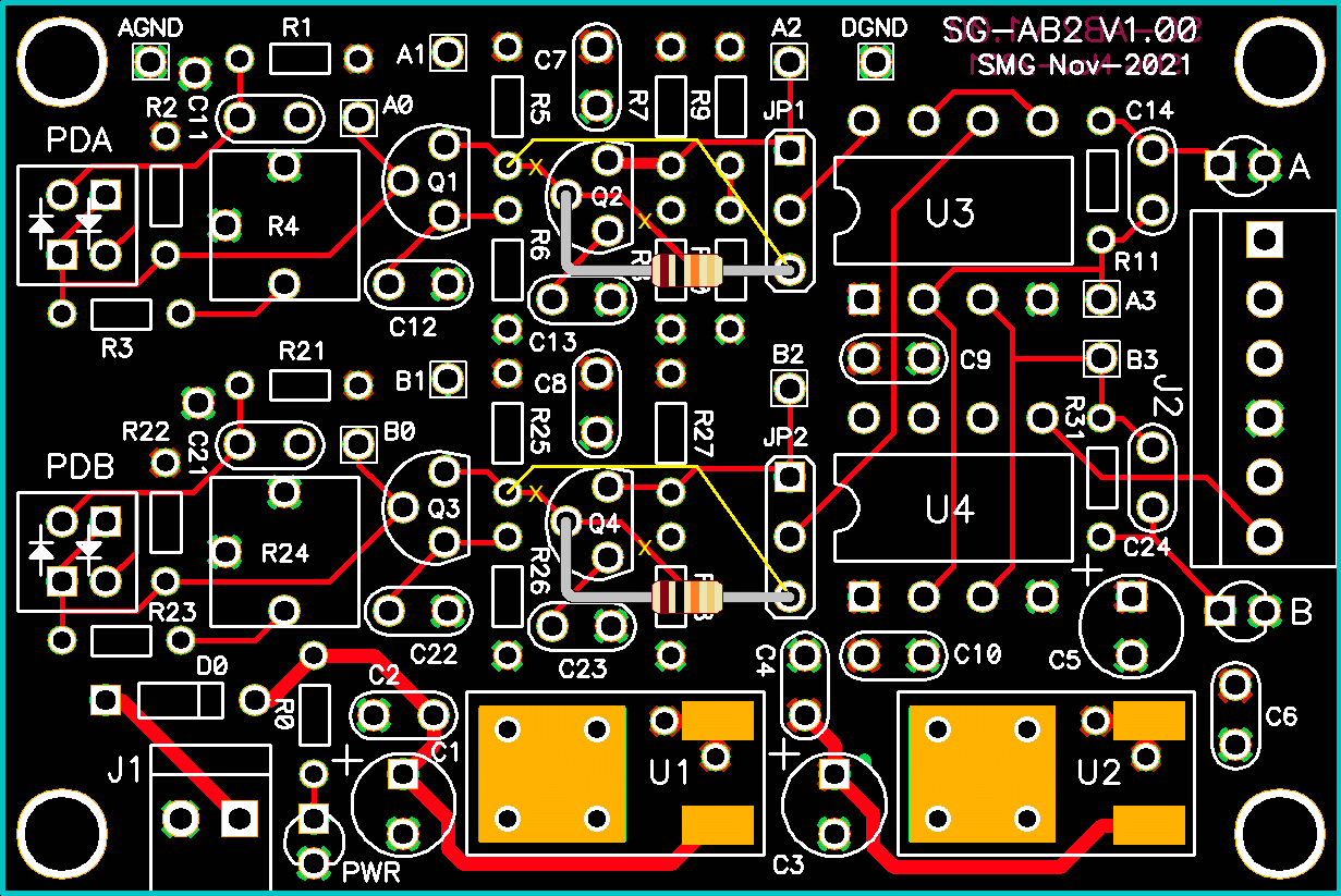 The actual SG-AB2 PCB is four layers with internal power and ground planes.