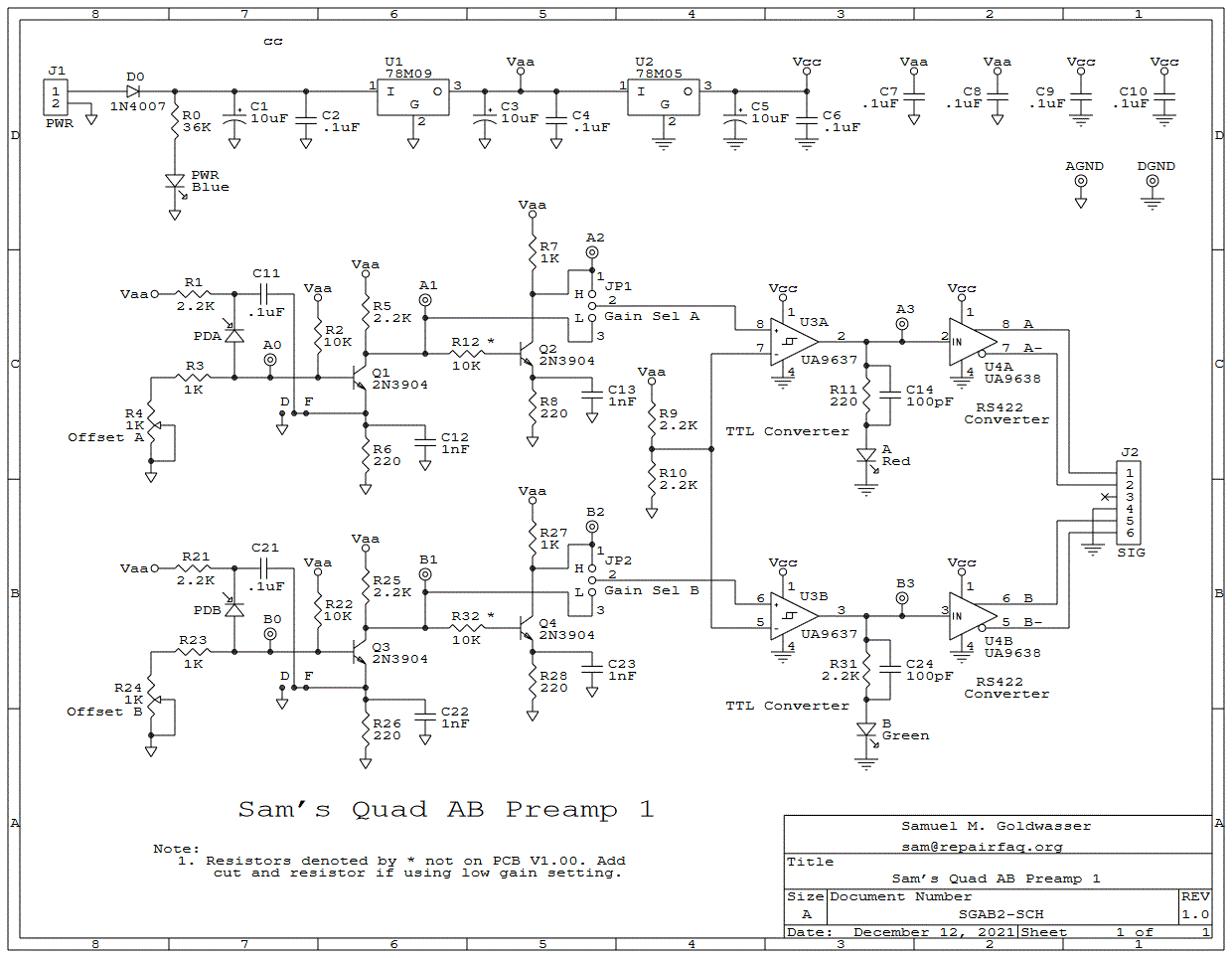 There are presently two available kits, the "Quadrature-Sin-Cos decoder" with or without the "Interface to µMD0 or RS422" (including µMD0). (For more information on µMD0 and more, see the links on Sam's Electronics and Laser Kit Information and Manuals page.