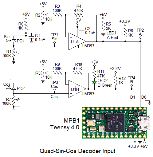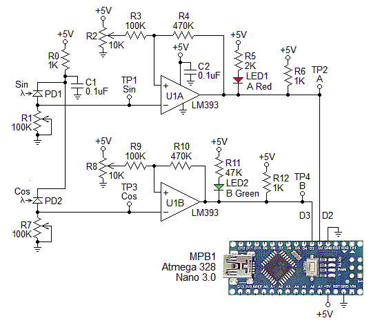 Prt# Description Comments ----------------------------------------------------------------------- U1 LM393P, 8 pin DIP Dual voltage comparator C2 0.1 µF capacitor Power supply bypass for U1 LED1 LED, red Thresholded Sin, A LED2 LED, HB green Thresholded Sin, B R0 Resistor, 1K Photodiode protection R1 Trim-pot, 100K-200K Sin (Channel A) load resistor* R2 Trim-pot, 10K Sin (Channel A) threshold R3 Resistor, 100K Sin (Channel A) trim-pot isolation R4 Resistor, 470K Sin (Channel A) hysteresis R5 Resistor, 2K-2.2K Red LED current limiting R6 Resistor, 1K Channel A pullup R7 Trim-pot, 100K-200K Cos (Channel B) load resistor* R8 Trim-pot, 10K Cos (Channel B) threshold R9 Resistor, 100K Cos (Channel B) trim-pot isolation R10 Resistor, 470K Cos (Channel B) hysteresis R11 Resistor, 36K-47K Green LED current limiting R12 Resistor, 1K Channel B pullup SBB1 Solderless breadboard with 400 tie points